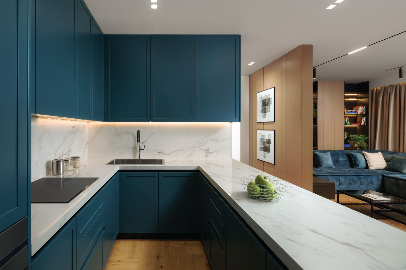 The kitchen introduces a striking contrast with matte teal cabinetry and white-veined marble countertops and backsplash, creating a fresh yet elegant atmosphere. Warm wood panels and integrated shelving with accent lighting balance the cooler tones, while natural oak flooring ties the entire apartment together with warmth.