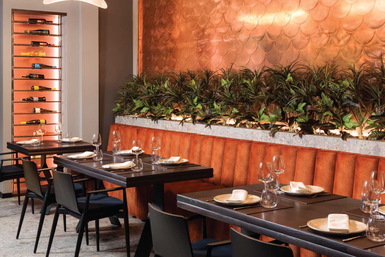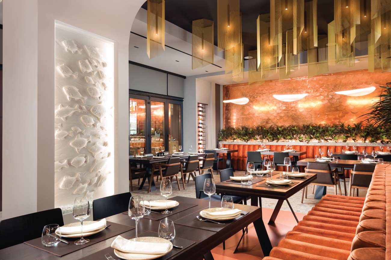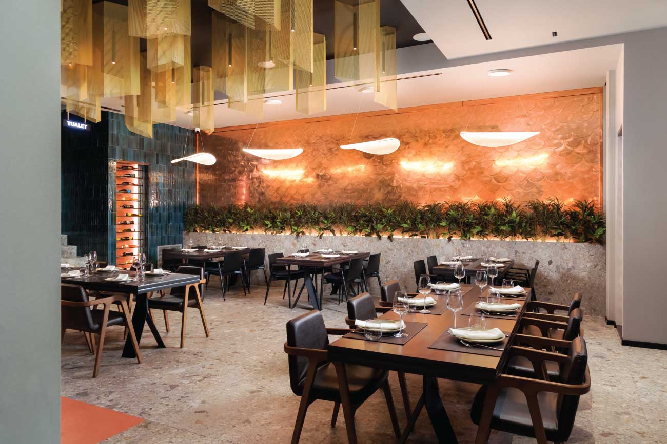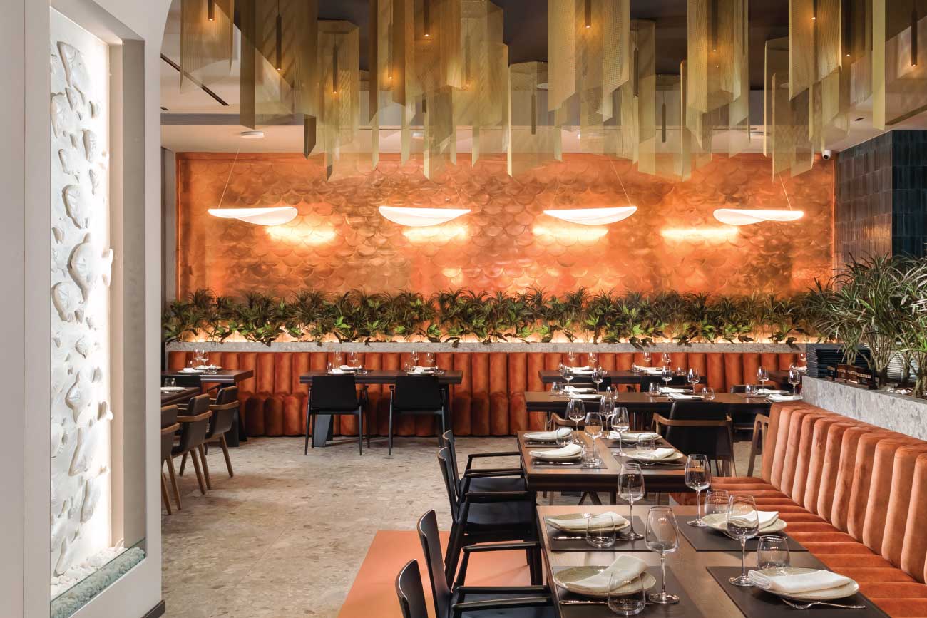 The 300 m² Björn Fish & Bistro is a restaurant that combines conceptual storytelling with bold design. Sculptural pendant lights, golden mesh ceiling panels that represent the flow of the sea, and a luminous copper wall with imprinted fish-scale textures set the mood.
