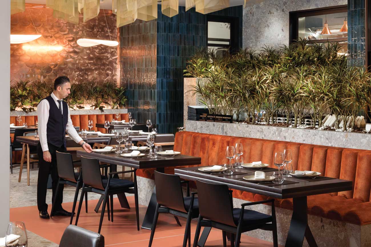 Dark wood tables, black chairs, and rust-orange banquettes provide a cozy, modern dining ambiance, while deep green tiles and natural stone terrazzo flooring offer depth. The concept continues into the details, such as terracotta and blue-toned toilets, carved fish reliefs, and illuminated wine displays that complete the story.