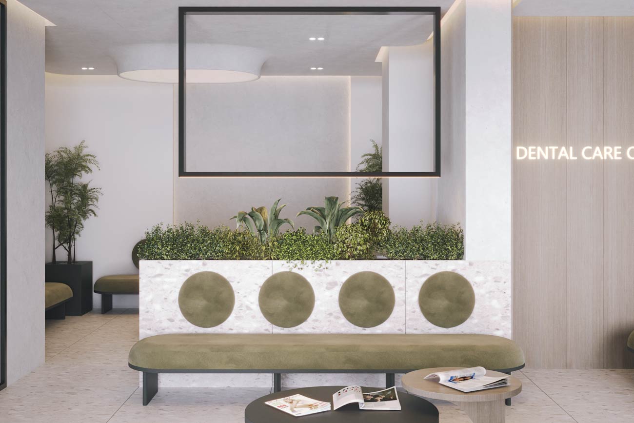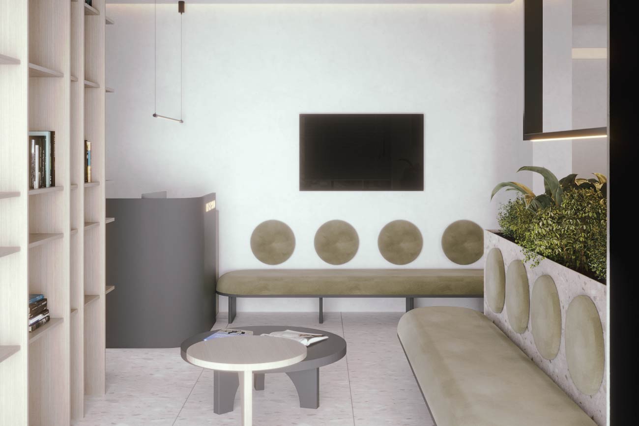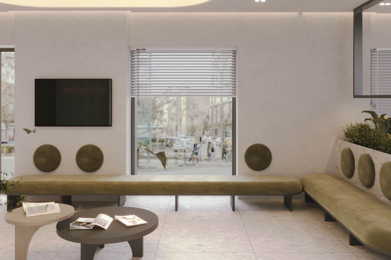 Designing a new office waiting area that is contemporary, cozy, and sensuous at the same time, mixing wood and fabrics to achieve a tasteful interior.