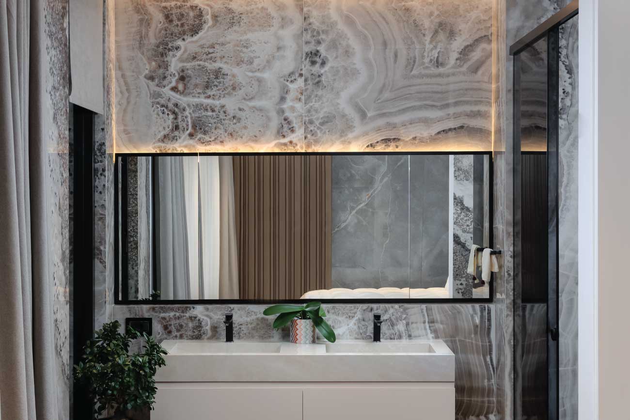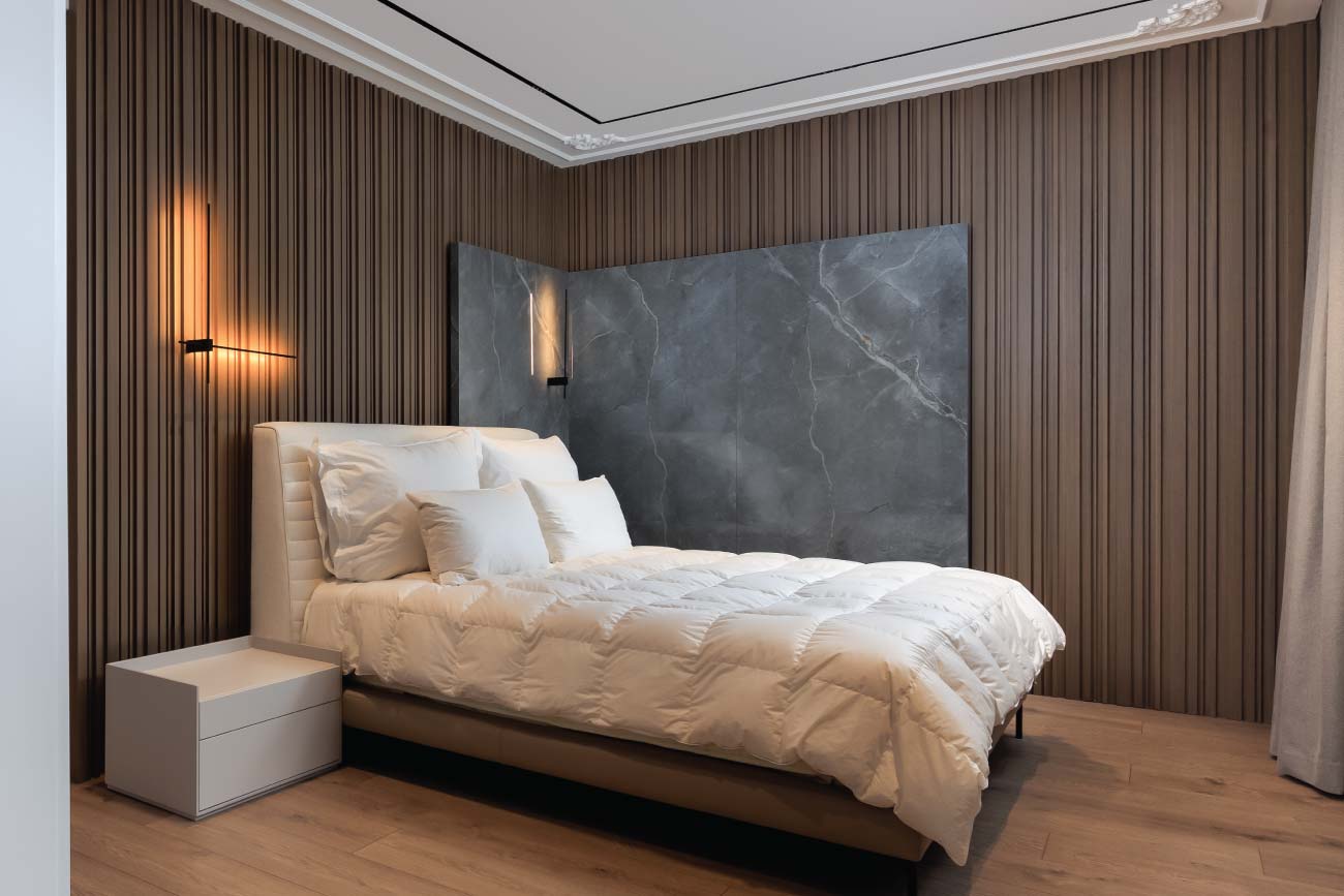 The master suite is peaceful yet elegant, with textured wall paneling, a custom walk-in closet, and magnificent stone finishes. With natural materials, subtle lighting, and tailored details, Mandarine Villa is the perfect blend of modern elegance and classic comfort.
