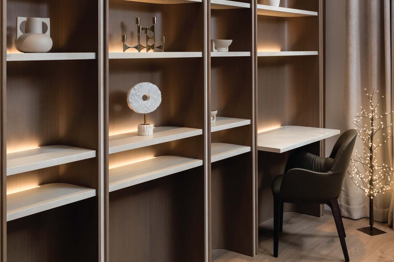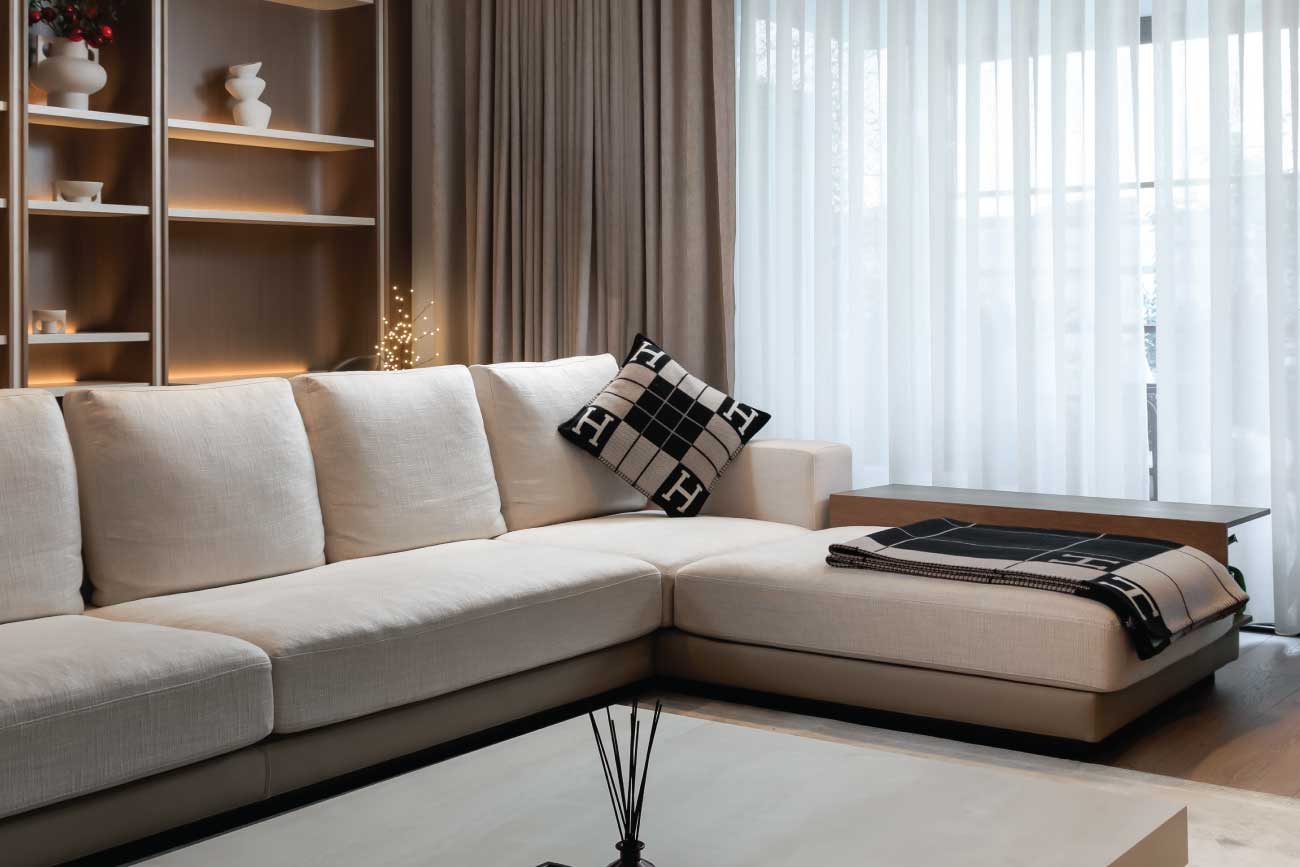 The Mandarine Villa is a 300 m² home where warm elegance meets contemporary design. Oak flooring, soft beige upholstery, and sculptural lighting set a serene tone, while marble-clad bathrooms and illuminated shelving add refinement.