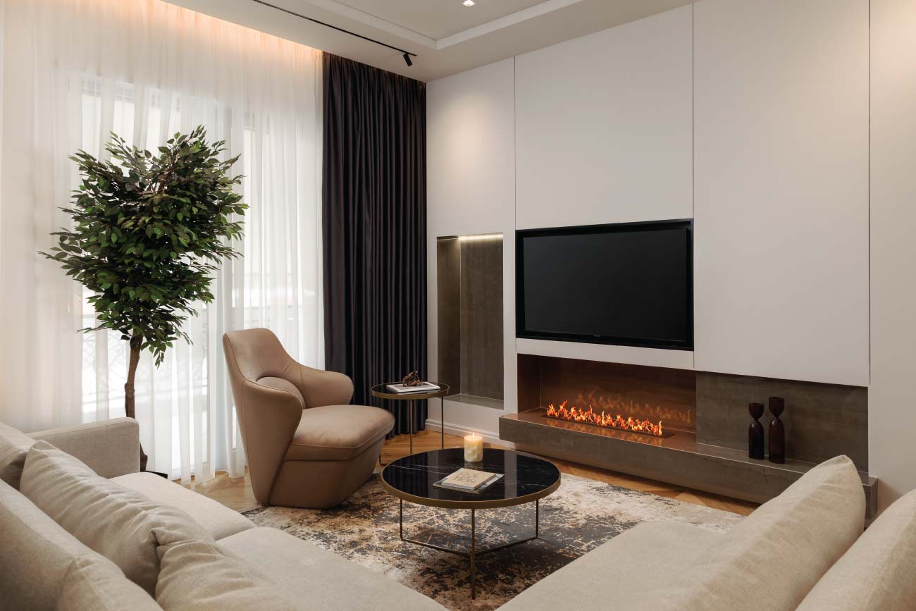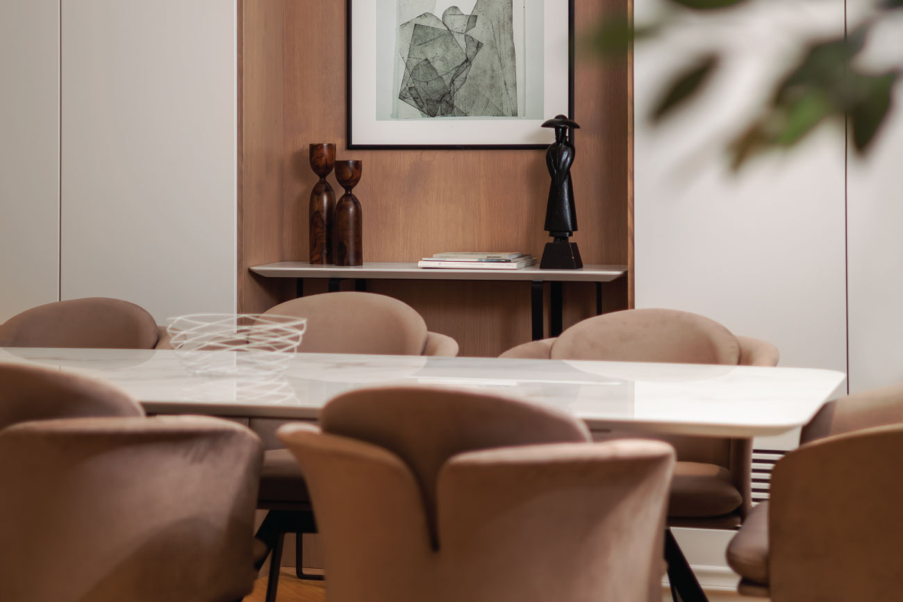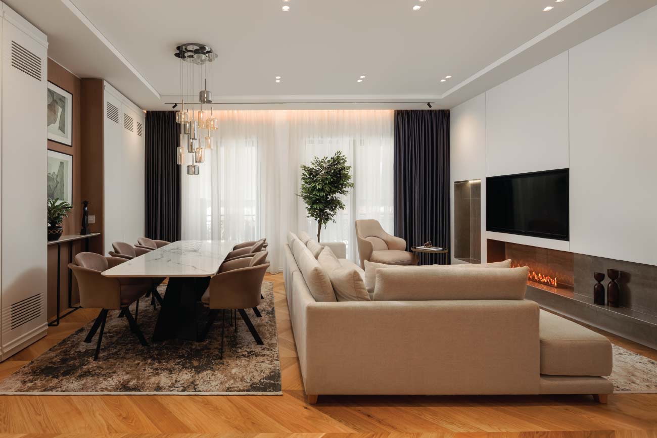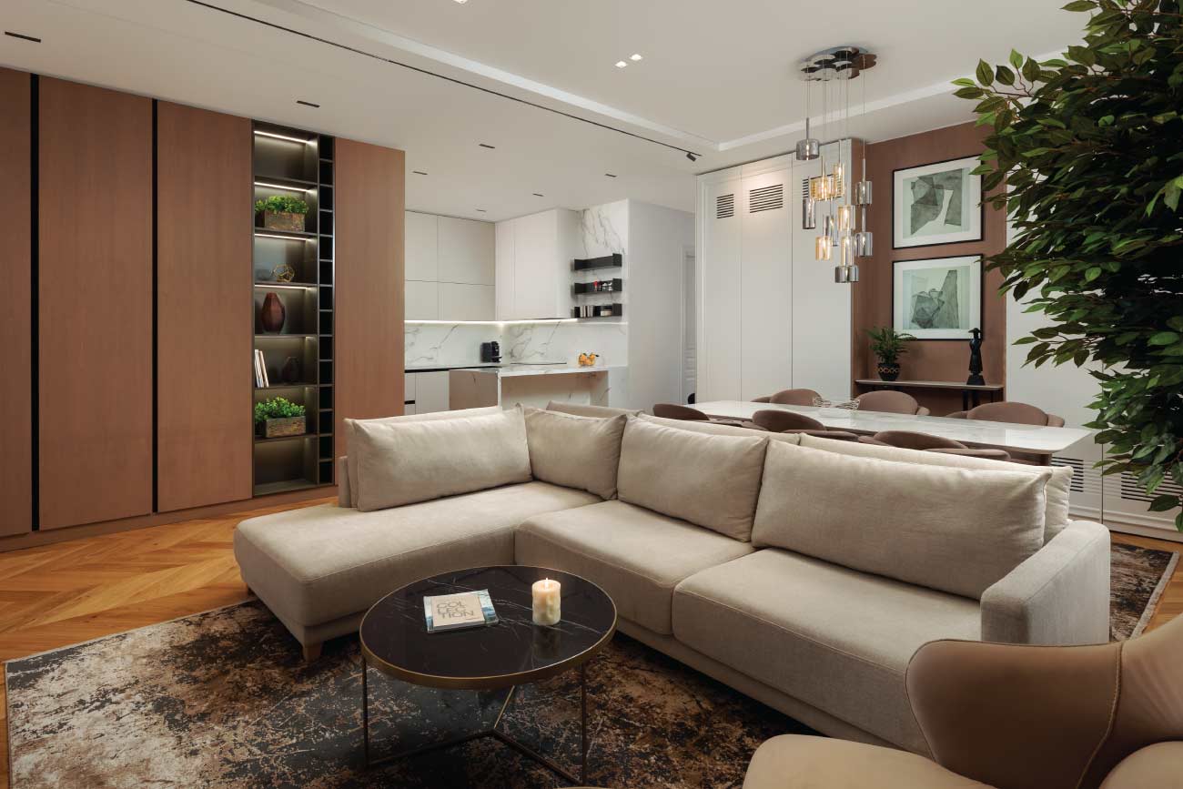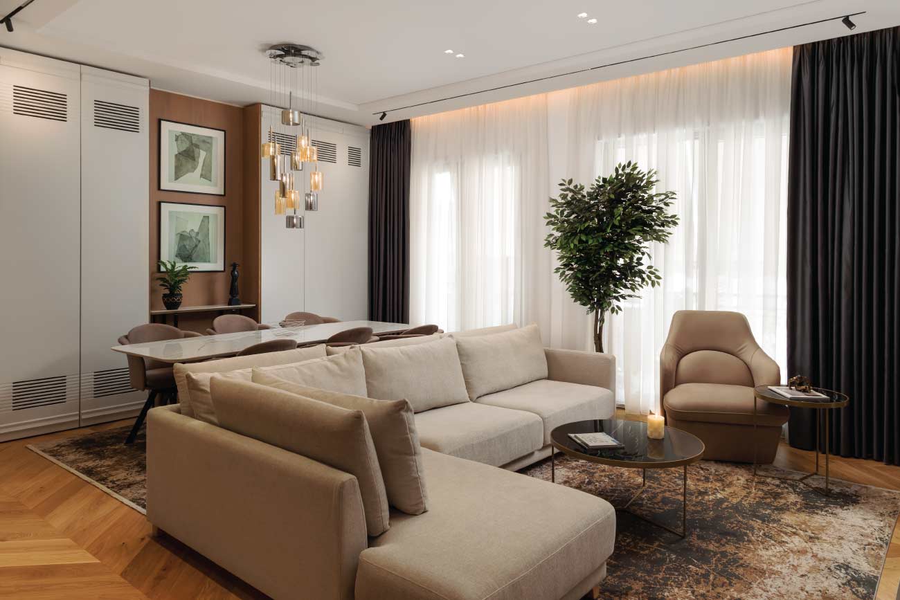The Nomad Apartment is a 150 m² residence that blends contemporary elegance with warm comfort. Oak chevron flooring, light-veined marble, and tailored wood cabinetry define the interiors, while neutral furnishings in beige and taupe are enhanced with dark marble tables and bronze accents.